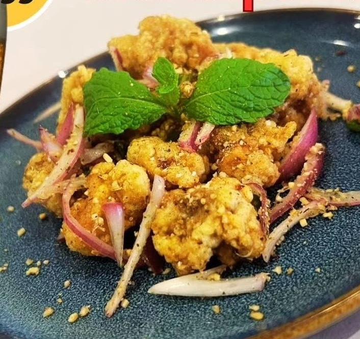 A zesty starter featuring tender chicken seasoned with lime and chili. Fresh herbs enhance the flavor while maintaining a light, vibrant taste. Perfect as an appetizer for Thai cuisine lovers who enjoy a spicy, tangy kick before the main course.