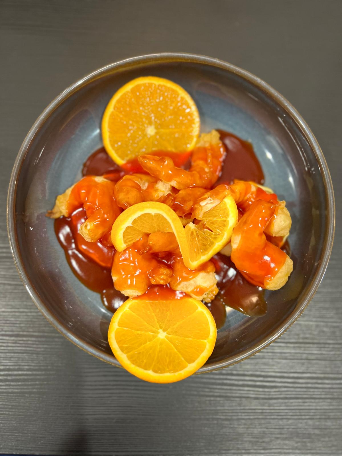 Juicy prawns cooked in a tangy and sweet orange sauce, lightly spiced and garnished with fresh herbs. A flavorful and aromatic dish that balances citrusy sweetness with savory notes.